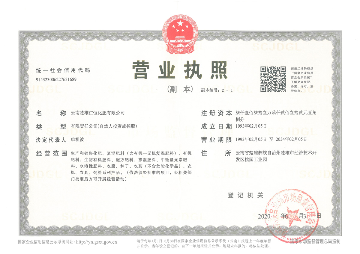 云南楚雄仁恒化肥有限公司于1993年2月5日正式成立,注册资本7174万元, 1995年3月正式投产。公司位于交通便利的楚雄经济技术开发区桃园工业园,占地100亩,建筑面积近40000平方米。公司现有员工90余人,其中大中专毕业生50人,专业技术人员42人。公司生产和销售复混肥料系列产品,现有两条喷浆转鼓造粒生产线,年生产能力为25万吨,是云南省大型复混肥料生产企业[详细介绍....]